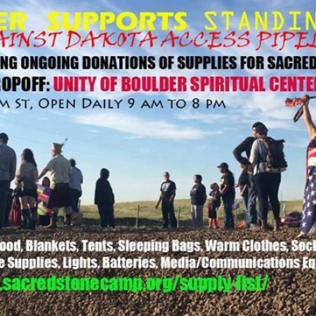 Unity of Boulder is Collecting Donations for North Dakota Oil Pipeline Protestors. Please drop off items at Unity from between the hours of 9am and 8pm daily.