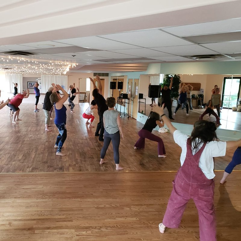 Hardwood floors with a wall of full length mirrors making the room perfect for dance performance, yoga and other wellness classes.