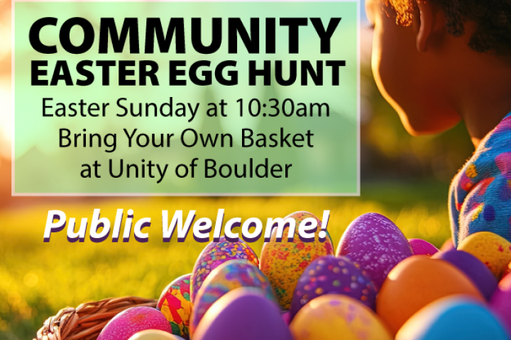 Join us at Unity of Boulder for our Annual Children’s Community Easter Egg Hunt on Easter Sunday at 10:30am. FREE & OPEN TO THE PUBLIC !When you arrive we’ll be gathering on the patio outside of Fellowship Hall. Bring your Easter Basket!