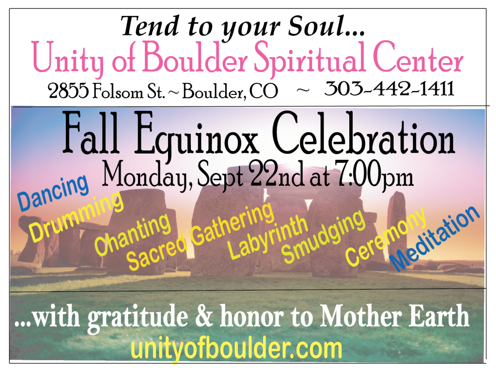 Please join us as we enter into a restful season for the Earth…a season of healing and re-energizing. At Unity our Equinox ceremony begins by creating a sacred space through sounds, sage and prayer. The power of drumming, chanting and dancing can transform the lives of those who attend this Equinox Ceremony and take them to the next level of their spiritual divinity! We will be walking the stone & crystal labyrinth outside during the ceremony, so if the weather is cool please bring a jacket to wear.