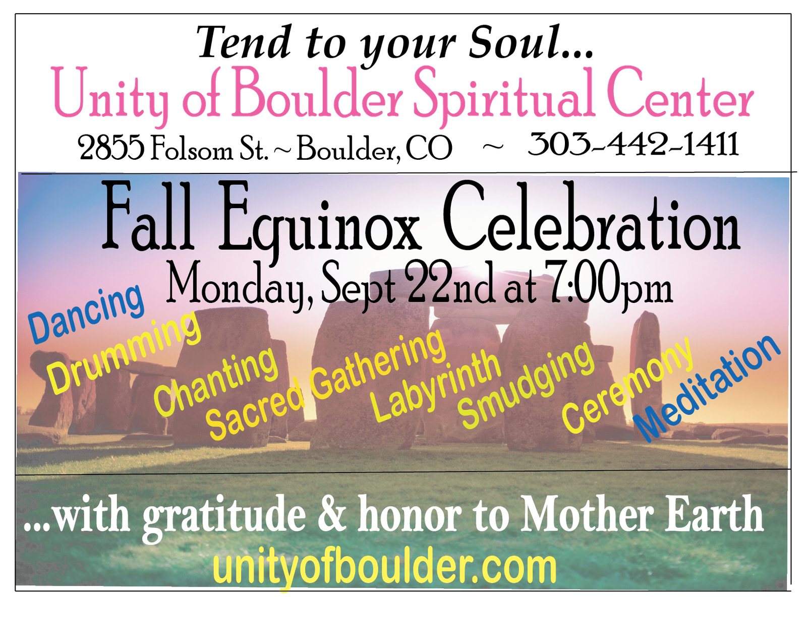 Please join us as we enter into a restful season for the Earth…a season of healing and re-energizing. At Unity our Equinox ceremony begins by creating a sacred space through sounds, sage and prayer. The power of drumming, chanting and dancing can transform the lives of those who attend this Equinox Ceremony and take them to the next level of their spiritual divinity! We will be walking the stone & crystal labyrinth outside during the ceremony, so if the weather is cool please bring a jacket to wear.