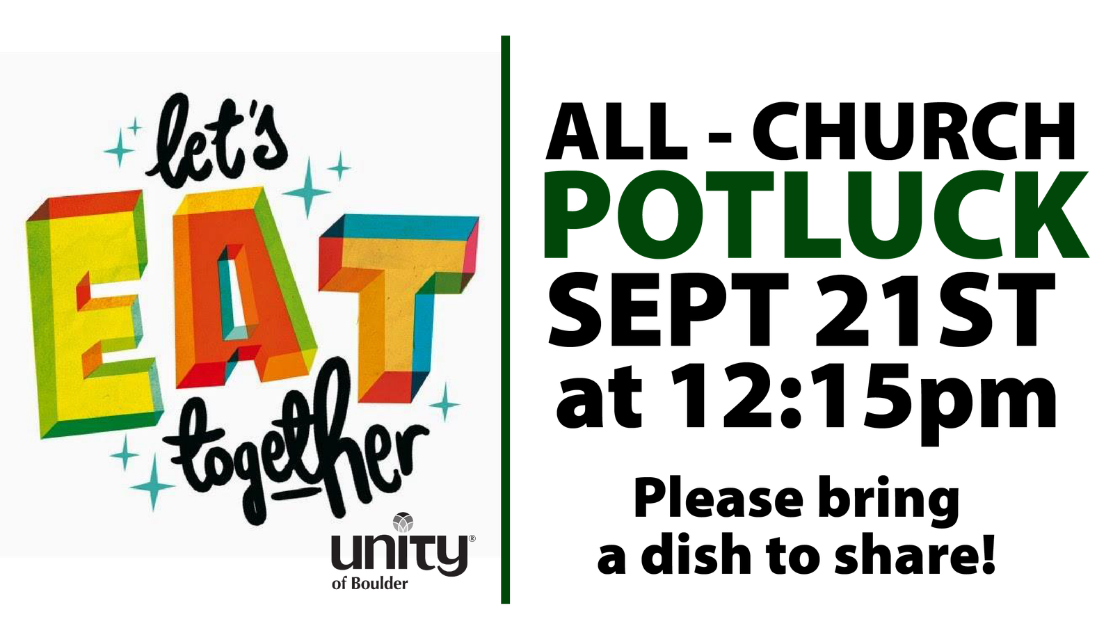 Bring your favorite dish to share and join us for a potluck lunch. We’ll eat some good food, chat with friends, and visit with the ministers. If you would like to volunteer to help setting up or with clean up please email us and let us know at boulderunity@yahoo.com.