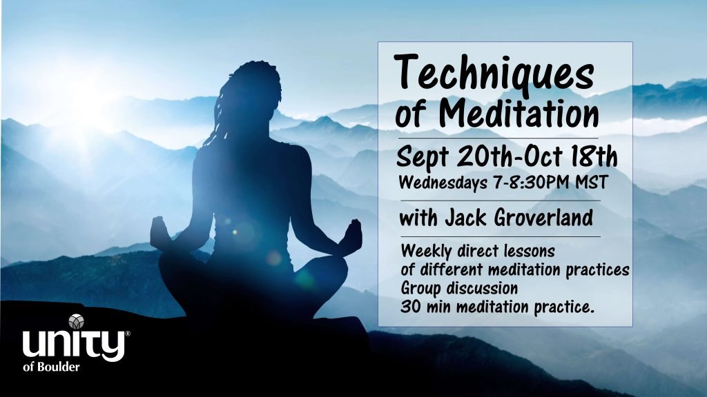 Beginning Wednesday, Sept 20th, 2023 our midweek meditation service, will be changed to a “Techniques Of Meditation” Class given by Rev. Jack Groverland. Everyone completing this 5 week class (7pm to 8:30 pm Wednesdays) will be eligible to become an “Official Unity Member” . Anyone missing the first class because of this short notice may make it up at the conclusion of the class or by completing a special assignment,