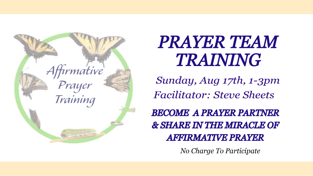 “Prayer Partners” are available to you after both Sunday Services. We use what we call “surround prayer” to pray for the names submitted into the center’s prayer box . If you are interested in serving as a member of our Prayer Team, we welcome you to attend our next meeting.