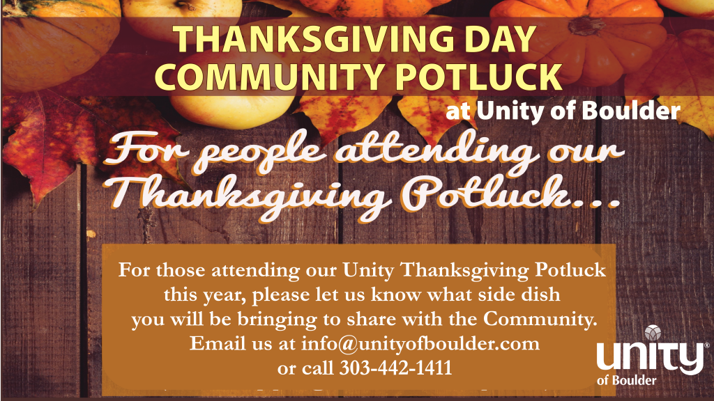 Thanksgiving is a day to spend with family and friends and to reflect on all the love and abundance in our lives. This Thanksgiving Day feast with us at Unity of Boulder. If you don’t have family in town or need a the warmth of community to carry you through the holidays, we invite you to join us. Our annual Thanksgiving Potluck is a wonderful way to connect with the Divine and give thanks for all the beauty in our lives!