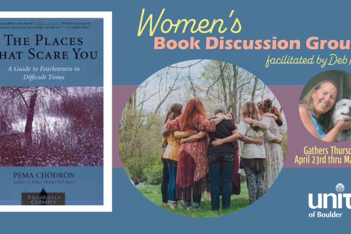 Women’s Book Discussion Group: ”THE PLACES THAT SCARE YOU” Thursdays, April 16th – May 21st The Book Group will meet weekly on Thursdays from 6-7:30pm Facilitated by Deb King Book: ‘The Places That Scare You‘ by Pema Chodron ____________________________________________ REGISTRATION: $85 (+Book if needed available in the Unity Gift Shop) REGISTER ONLINE HERE OR In Person at our Gift Shop (OM Books & Gifts) To register by phone call 303-442-1411. Reading Assignment for First Week: pages 1-22 ____________________________________________ ABOUT OUR…