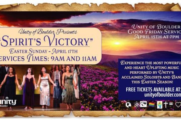 Featuring the Cantata “Spirit’s Victory!” With a musical performance by the acclaimed Unity Choir Soloists & the Unity Band. Unity of Boulder would like to invite you to spend Easter Morning celebrating the metaphysical meaning of the Easter Story! Although we share in the joy & festivities of the resurrection of Christ, Easter is so much more. ___________________________________ Every Sunday at Unity of Boulder Spiritual Center we strive to bring you an Universal Spiritual Experience that embraces the commonalities of…