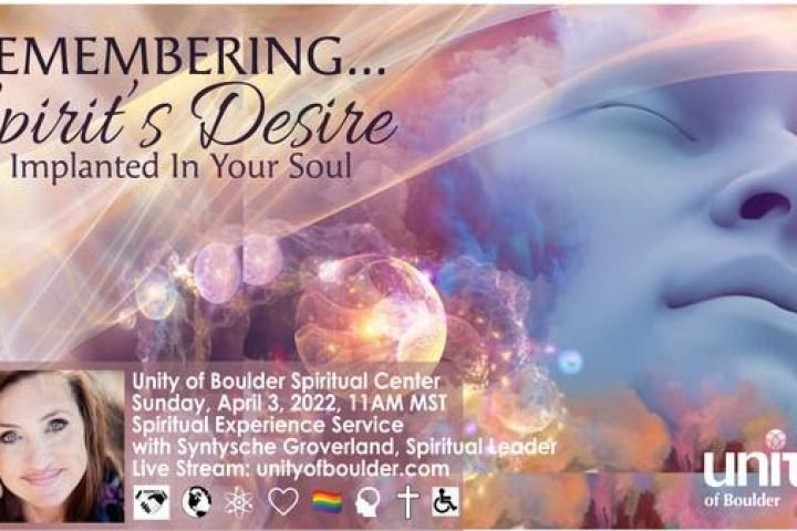 April 3, 202211AM MST Spiritual Experience ServiceWith A Spiritual Talk Given By Syntysche Groverland THIS WEEK: ‘Remembering Spirit’s Desire Implanted In Your Soul’Enjoy an inspirational spiritual Talk about an experience Syntysche had in meditation–where everything made sense, the veils were pulled back from the “ethers”, giving her witness to the knowledge of her own soul, revealing all the ways and thoughts and journeys that she took where she missed the mark. And in all of it, she discovered there was…
