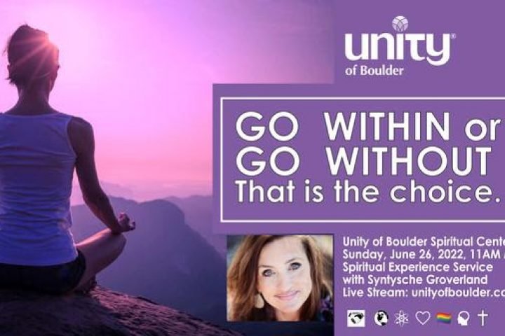 11AM MST, Sunday June 26, 2022Spiritual Experience ServiceLed by Spiritual Leader, Syntysche Groverland THIS WEEK: ‘Go Within or Go Without, That is the Choice.’A collective heart opening experience, where you will re-align with your Divine Power and remember you are not alone, but joined with your Community. Every Sunday at Unity of Boulder Spiritual Center we strive to bring you an Universal Spiritual Experience that embraces the commonalities of all walks of faith on the spiritual path. We embrace the…