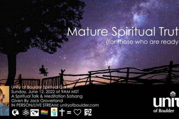 Satsang & Group Meditation9AM MST, Sunday August 8, 2022With a Talk Given by Jack Groverland THIS WEEK’S SPIRITUAL MESSAGE:‘The Second Coming’Jack will reveal the actual Gospel Scriptures which will open your mind to the fact that the Second Coming occurs when Jesus, the miracle-working man in history becomes the Christ in You! Norma will share the beautiful meditative sounds of theTibetan Singing Bowls in a live performance. ABOUT UNITY OF BOULDER:Every Sunday at Unity of Boulder Spiritual Center we strive…